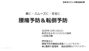 製造業の現場課題に対応した腰痛予防 体験型セミナーです。本事例では東京都八王子市にある日本ポリテック株式会社様で実施した体験型セミナーの報告です。